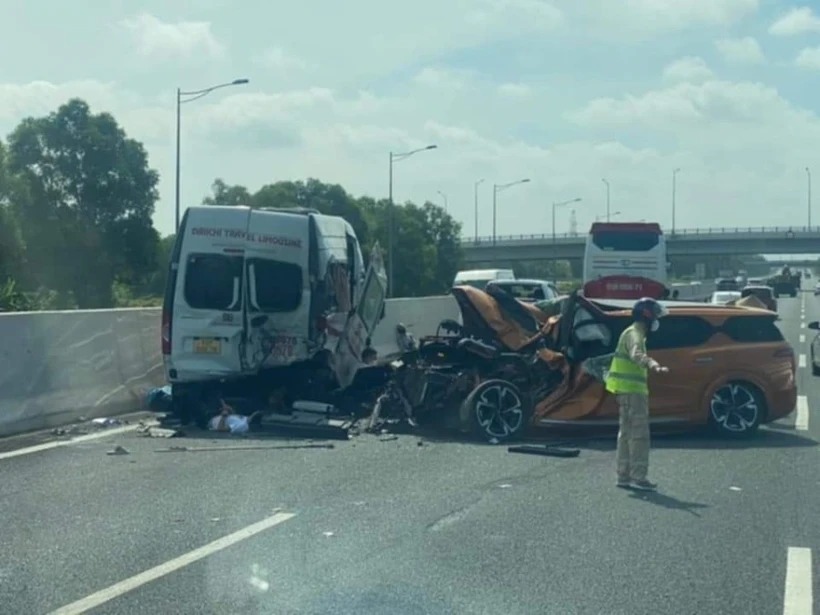 Hiện trường vụ tai nạn xảy ra trên cao tốc Hà Nội-Hải Phòng sáng 11/7/2024. (Ảnh: TTXVN phát)