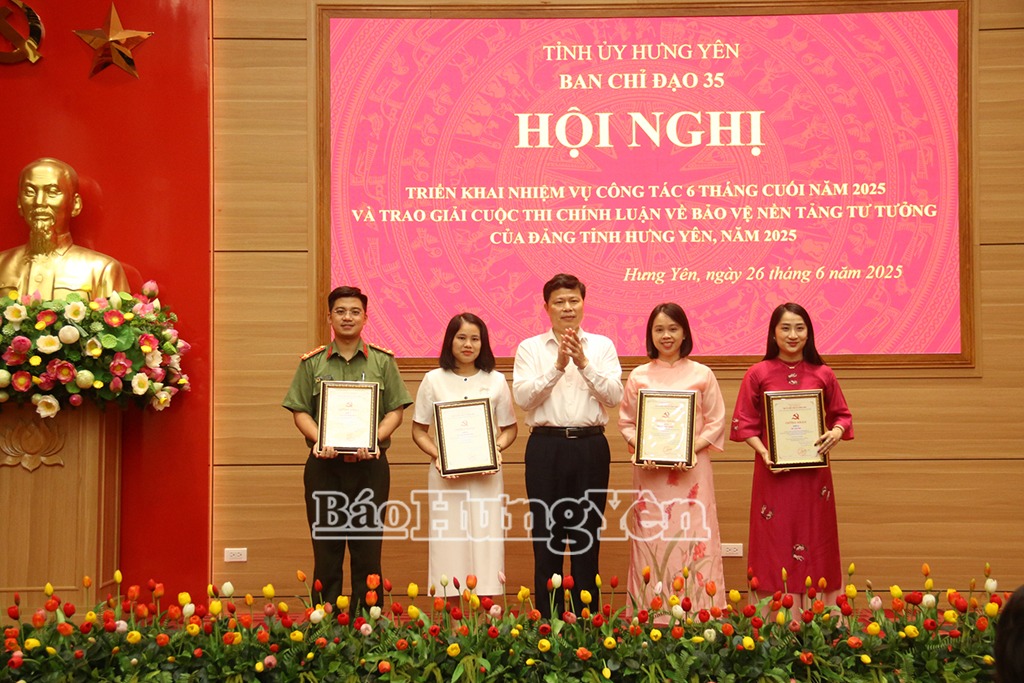 Ngày 26/6, tại trụ sở Tỉnh ủy, Ban tổ chức Cuộc thi Chính luận về bảo vệ nền tảng tư tưởng của Đảng tỉnh Hưng Yên năm 2025 tổ chức trao giải cho 34 tác giả, nhóm tác giả đoạt giải cuộc thi. Dự trao giải có các đồng chí: Trần Quốc Toản, Phó Bí thư Thường trực Tỉnh ủy, Chủ tịch HĐND tỉnh, Trưởng ban tổ chức cuộc thi; Quách Thị Hương, Ủy viên Ban Thường vụ Tỉnh ủy, Trưởng ban Tuyên giáo và Dân vận Tỉnh ủy, Phó Trưởng ban Thường trực Ban tổ chức cuộc thi.