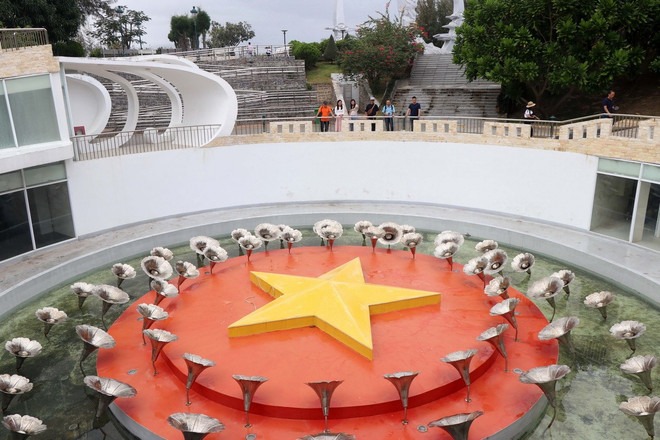 Hồ nước “Vòng tròn bất tử” thiêng liêng tại Khu tưởng niệm chiến sỹ Gạc Ma ở xã Cam Hải Đông, huyện Cam Lâm, tỉnh Khánh Hòa với 64 đóa hoa, tượng trưng cho 64 người con anh dũng cùng ôm lấy lá cờ đỏ sao vàng nổi trên mặt nước. (Ảnh: Hữu Quyết/TTXVN)
