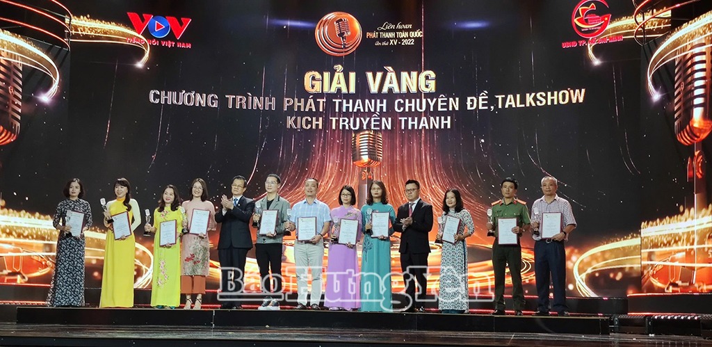 Đồng chí Lê Quốc Minh, Ủy viên BCH Trung ương Đảng, Tổng Biên tập Báo Nhân Dân, Chủ tịch Hội Nhà báo Việt Nam trao giải Vàng cho Đài Phát thanh và Truyền hình Hưng Yên và các đơn vị đoạt giải Vàng tại Liên hoan phát thanh toàn quốc năm 2022 (Ảnh: Phạm Thành)