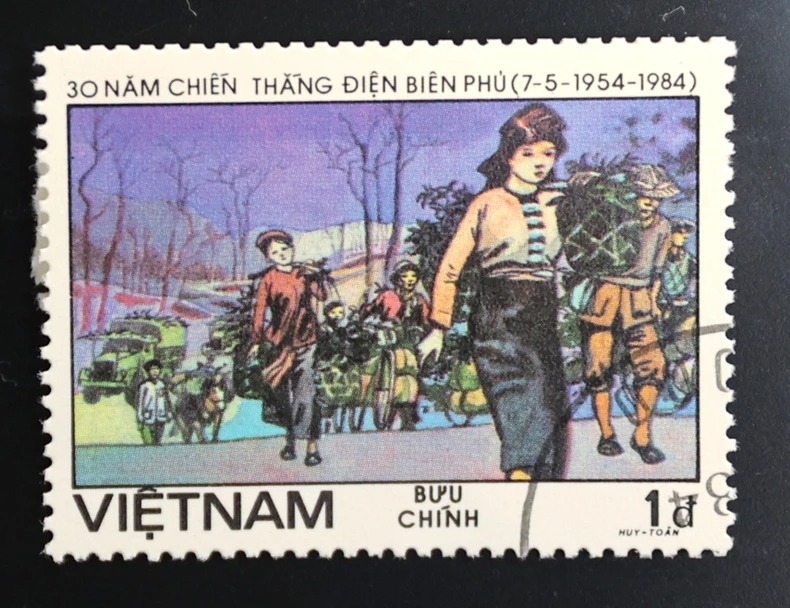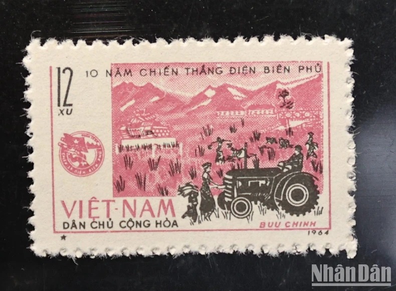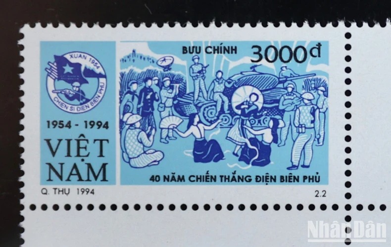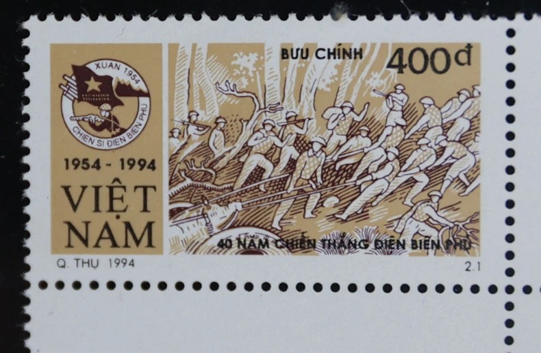 Trong ảnh là bộ tem Chiến thắng Điện Biên Phủ đầu tiên, phát hành tháng 10/1954, do họa sĩ Bùi Trang Chước thiết kế, sử dụng hình ảnh lịch sử những người lính đang cắm cờ chiến thắng trên nóc hầm tướng Đờ Cát.