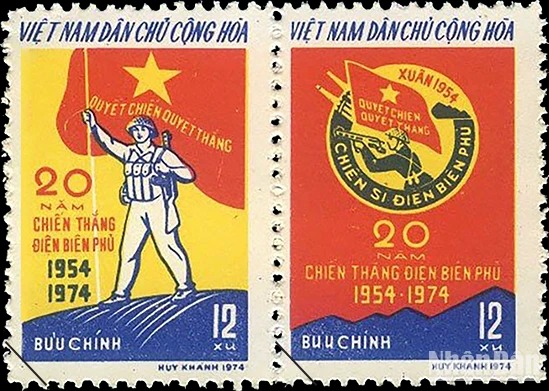 Bộ tem kỷ niệm 20 năm Chiến thắng Điện Biên Phủ (1954-1974), thể hiện hình ảnh người chiến sĩ phất cao lá cờ Quyết chiến quyết thắng trên nóc hầm tường Đờ Cát và Huy hiệu Chiến sĩ Điện Biên Phủ. Tem do họa sĩ Trần Huy Khanh thiết kế, có giá 12 xu.