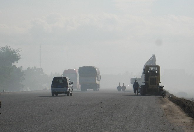 Các phương tiện tham gia giao thông trong khói bụi. (Nguồn ảnh: TTXVN)