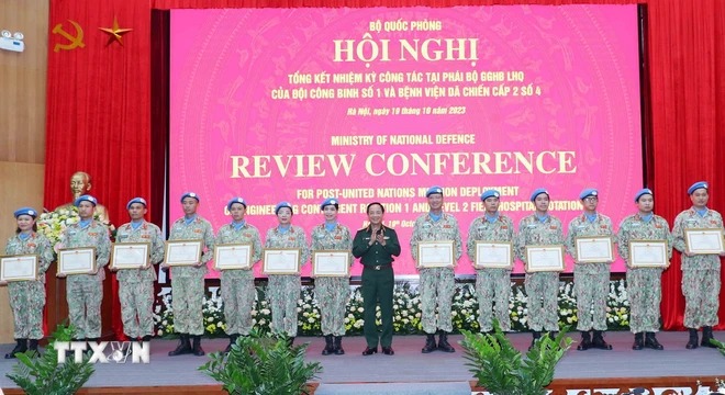 Ngày 19/10/2023, tại Hà Nội, Cục Gìn giữ hòa bình Việt Nam (Bộ Quốc phòng) tổ chức Hội nghị Tổng kết nhiệm kỳ công tác Phái bộ Gìn giữ hòa bình Liên hợp quốc của Đội Công binh số 1 và Bệnh viện dã chiến cấp 2 số 4. (Ảnh: An Đăng/TTXVN)
