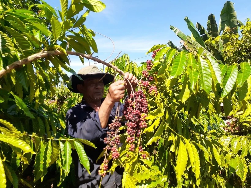 Thu hoạch càphê ở ấp Sông Xoài 2, xã Láng Lớn (Châu Đức, Bà Rịa-Vũng Tàu). (Ảnh: Hoàng Nhị/TTXVN)