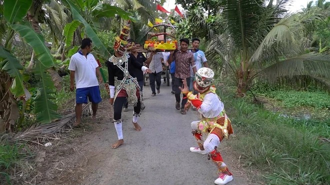 Người dân đưa kiệu trong nghi thức tống tàu của lễ hội Đom Lơng Néak Tà ở Trà Vinh. (Ảnh: TTXVN phát)