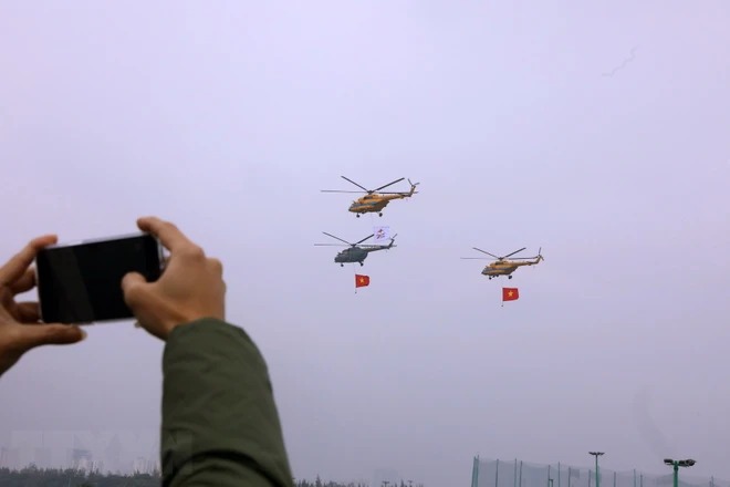 Biên đội trực thăng dòng Mi thuộc Trung đoàn Không quân 916 cùng cờ Tổ quốc và cờ hiệu Triển lãm Quân sự Quốc tế Việt Nam 2022 biểu diễn trên không gian triển lãm năm 2022. (Ảnh: Văn Điệp/TTXVN)