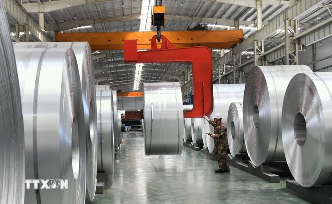 Vận chuyển thép cuộn tại nhà máy ở Châu Bình, tỉnh Sơn Đông, Trung Quốc. (Ảnh: AFP/TTXVN)