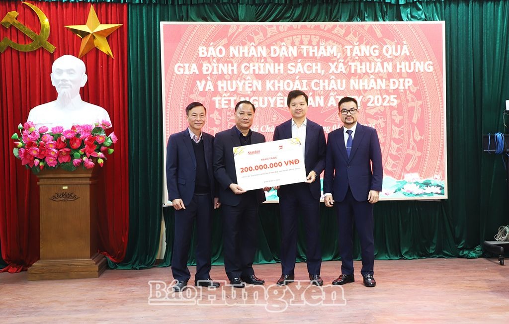 Cùng ngày, tại Huyện ủy Khoái Châu, Báo Nhân Dân trao 200 triệu đồng tặng các gia đình chính sách trên địa bàn huyện và 100 triệu đồng tặng các gia đình chính sách xã Thuần Hưng (Khoái Châu).