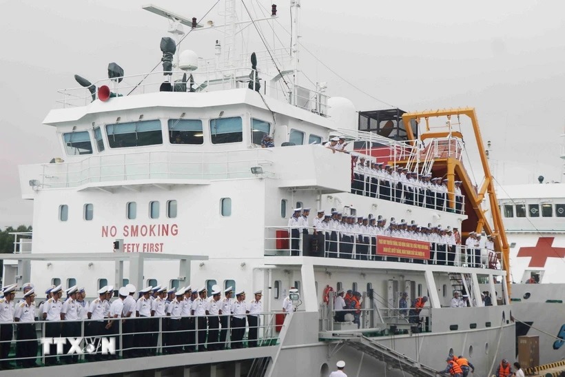 Ngày 26/12/2024, tại Quân cảng Cam Ranh, tỉnh Khánh Hòa, Bộ Tư lệnh Vùng 4 Hải quân tổ chức Lễ tiễn đoàn công tác ra thăm, chúc Tết cán bộ, chiến sỹ và nhân dân đang làm nhiệm vụ và sinh sống trên các đảo thuộc huyện đảo Trường Sa. (Ảnh: Hữu Quyết/TTXVN)