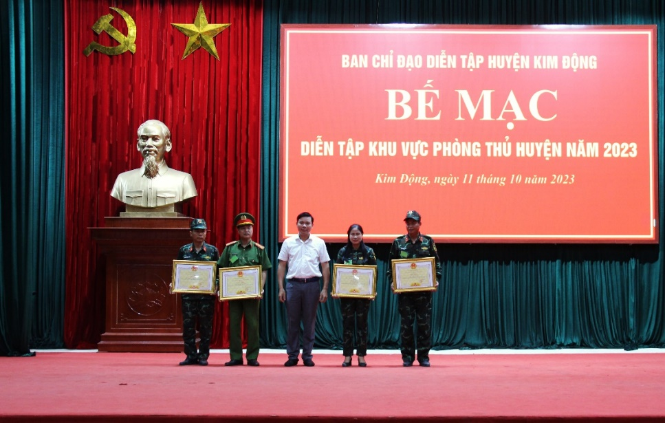 Nhân dịp này, Chủ tịch UBND tỉnh tặng Bằng khen 2 tập thể, 2 cá nhân có thành tích xuất sắc trong thực hiện nhiệm vụ diễn tập KVPT huyện Kim Động năm 2023.