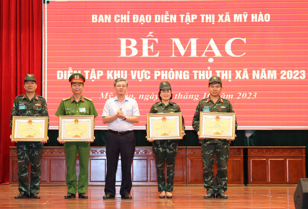 Nhân dịp này, Chủ tịch UBND tỉnh tặng Bằng khen 2 tập thể, 2 cá nhân; Chủ tịch UBND thị xã tặng Giấy khen cho 15 tập thể, 32 cá nhân có thành tích xuất sắc trong thực hiện nhiệm vụ diễn tập KVPT thị xã Mỹ Hào năm 2023.