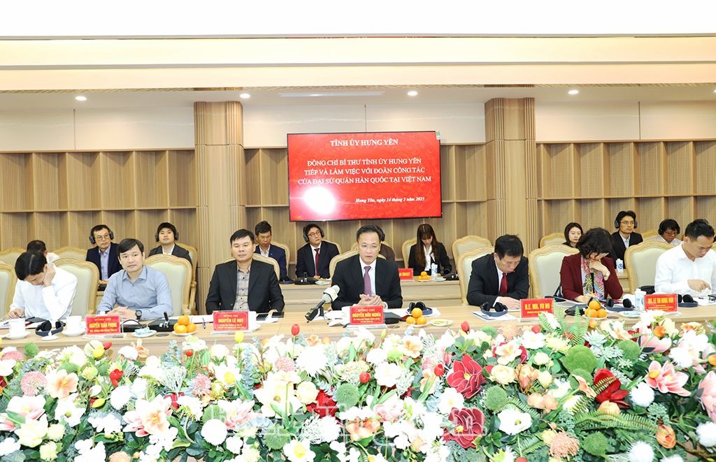 Với tinh thần xây dựng chính quyền kiến tạo, liêm chính, hành động, coi thành công của doanh nghiệp cũng chính là thành công của mình, tỉnh Hưng Yên cam kết sẽ luôn tạo điều kiện thuận lợi nhất cho các nhà đầu tư nói chung và nhà đầu tư đến từ Hàn Quốc trong khuôn khổ hành lang pháp lý; mong muốn, thời gian tới tỉnh Hưng Yên tiếp tục nhận được sự hỗ trợ của Đại sứ quán Hàn Quốc tại Việt Nam trong việc xúc tiến đầu tư, thương mại và du lịch, đón nhận nguồn vốn ODA của Chính phủ Hàn Quốc… Tỉnh Hưng Yên sẵn sàng phối hợp với Đại sứ quán Hàn Quốc tại Việt Nam tăng cường mối quan hệ đối ngoại, tổ chức Tuần lễ văn hóa, giao lưu Nhân dân nhằm góp phần thiết thực thúc đẩy quan hệ Đối tác chiến lược toàn diện Việt Nam - Hàn Quốc.