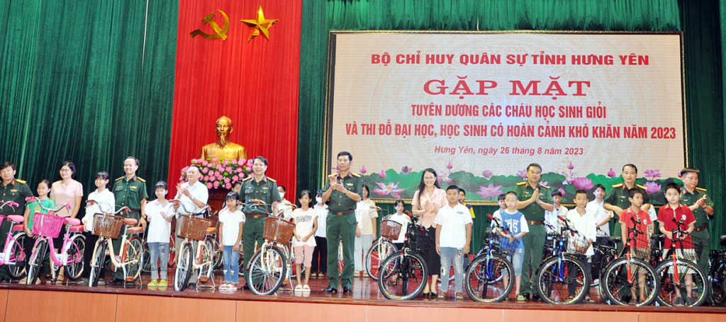 Tại buổi gặp mặt, lãnh đạo Bộ CHQS tỉnh biểu dương những thành tích của các học sinh, động viên các em tiếp tục học tập, đạt thành tích cao hơn nữa trong năm học tới; đặc biệt các học sinh là con gia đình cán bộ, nhân viên có hoàn cảnh khó khăn nhưng vẫn vươn lên đạt thành tích cao trong học tập. Lãnh đạo Bộ CHQS tỉnh trao thư khen và các phần quà với tổng số tiền gần 150 triệu đồng. Ngoài ra, Bộ CHQS tỉnh tặng xe đạp cho 45 học sinh có hoàn cảnh khó khăn đạt thành tích cao trong học tập.
