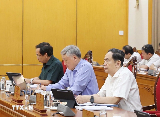 Bộ Chính trị họp cho ý kiến về tình hình, tiến độ thực hiện các nghị quyết, kết luận của Trung ương, Bộ Chính trị về sắp xếp tổ chức bộ máy và đơn vị hành chính. (Ảnh: Thống Nhất/TTXVN)