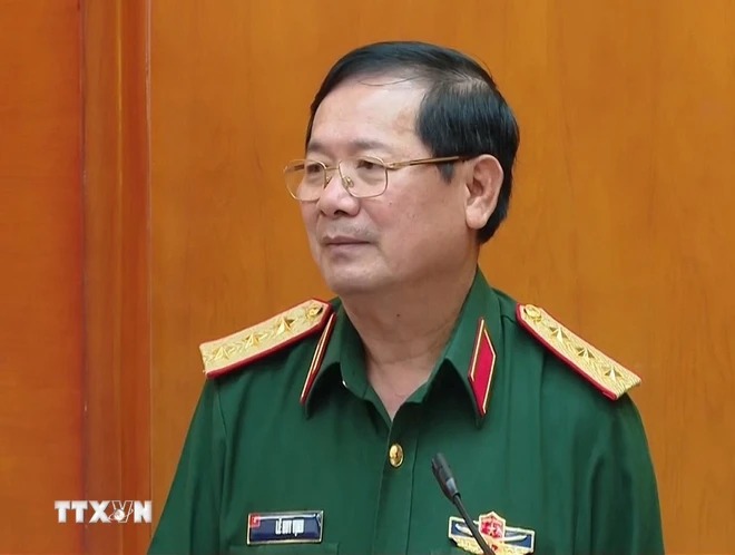 Thượng tướng Lê Huy Vịnh, Thứ trưởng Bộ Quốc phòng phát biểu tại hội nghị. (Ảnh: TTXVN phát)