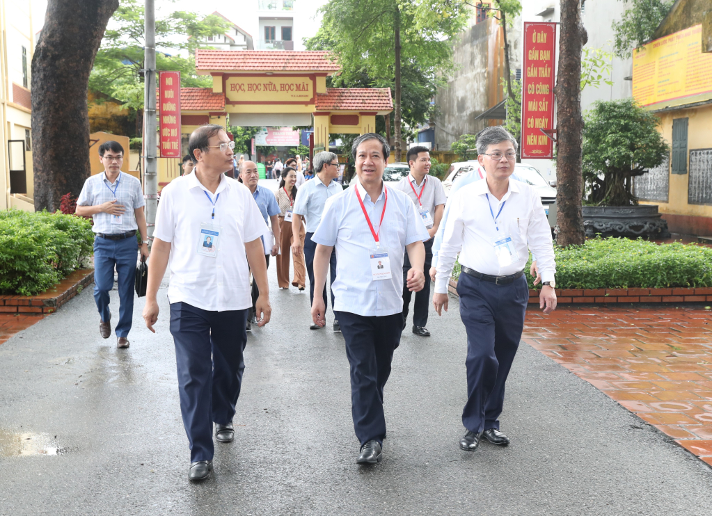 Bộ trưởng Bộ Giáo dục và Đào tạo Nguyễn Kim Sơn và đoàn công tác đến thăm, kiểm tra một số phòng thi, phòng Hội đồng và trao đổi với các cán bộ, giáo viên đang làm nhiệm vụ tại điểm thi. Bộ trưởng Bộ Giáo dục và Đào tạo lưu ý cán bộ coi thi nhắc thí sinh không bắt buộc phải đeo khẩu trang, các phòng thi nằm trong khu vực khuôn viên trường nên mở các cửa sổ, ô thoáng để tạo điều kiện thuận lợi giúp các thí sinh dự thi tốt nhất.