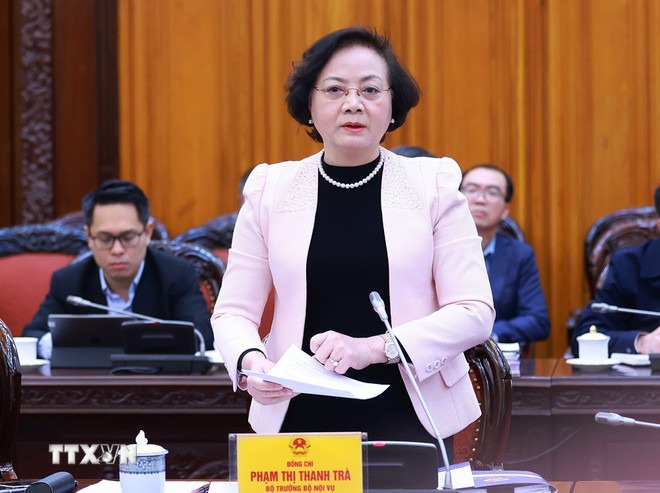Bộ trưởng Bộ Nội vụ Phạm Thị Thanh Trà báo cáo tiến độ thực hiện sắp xếp, tinh gọn bộ máy của Chính phủ. (Ảnh: Dương Giang/TTXVN)