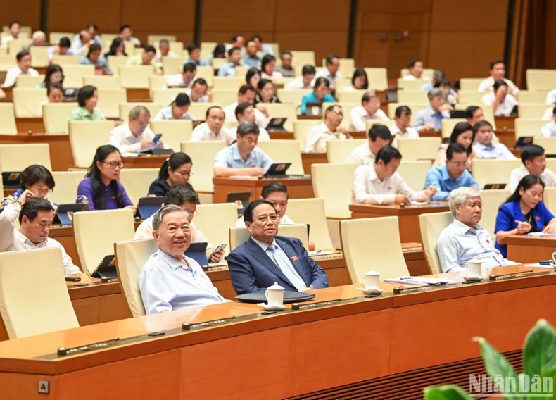 Các đồng chí lãnh đạo Đảng, Nhà nước và các đại biểu Quốc hội dự phiên thảo luận ở hội trường chiều 27/5. (Ảnh: DUY LINH)