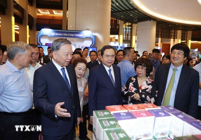Tổng Bí thư Tô Lâm và các đại biểu tham quan triển lãm "Những thành tựu trong xây dựng và thực thi pháp luật" và "Những thành tựu trong phát triển kinh tế tư nhân và các gian hàng trưng bày sản phẩm của các doanh nghiệp tư nhân." (Ảnh: Thống Nhất/TTXVN)