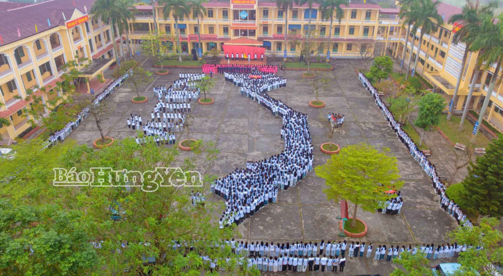 Cán bộ, giáo viên, học sinh Trường THPT Vũ Tiên (xã Thư Vũ) xếp hình Tổ quốc khi thực hiện nghi thức chào cờ.