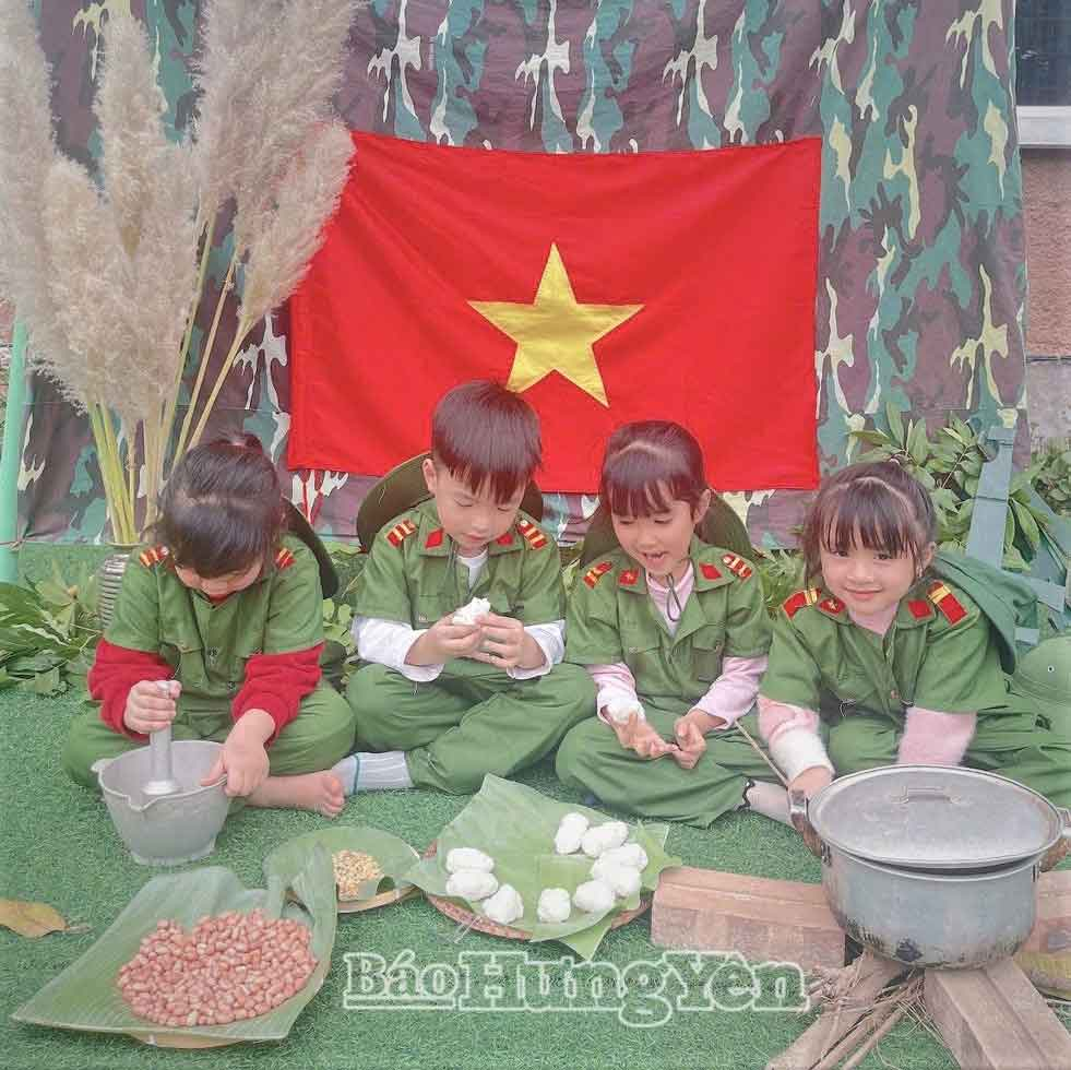 Các em nhỏ Trường Mầm non Hàm Tử (xã Triệu Việt Vương) tham gia hoạt động trải nghiệm bữa cơm hành quân của các chiến sĩ nhí.