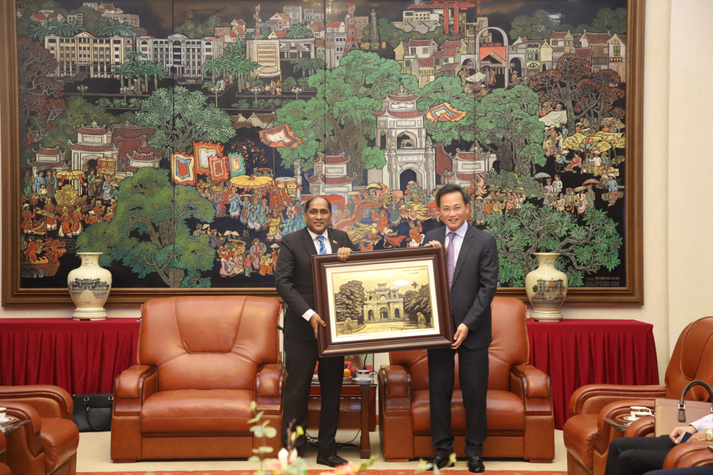 Bí thư Tỉnh ủy Nguyễn Hữu Nghĩa tặng ngài Đại sứ đặc mệnh toàn quyền nước Cộng hòa Singapore tại Việt Nam bức tranh Văn miếu Xích Đằng