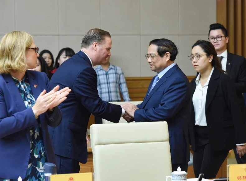 Thủ tướng Phạm Minh Chính bắt tay các đại biểu phía Hoa Kỳ. (Ảnh: TRẦN HẢI)
