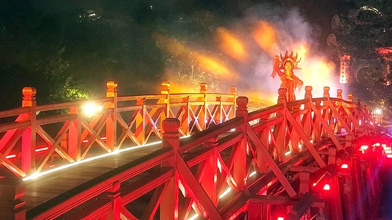 Tiết mục nghệ thuật trong chương trình trải nghiệm “Ngọc Sơn đêm huyền bí” tại đền Ngọc Sơn, hồ Hoàn Kiếm, Hà Nội. (Ảnh TC)