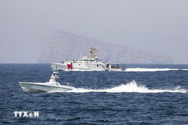 Tàu di chuyển tại Eo biển Hormuz. (Ảnh: IRNA/TTXVN)