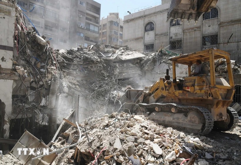 Hiện trường đổ nát sau vụ tấn công vào tòa nhà Lãnh sự quán Iran ở Damascus, Syria ngày 2/4. (Ảnh: THX/TTXVN)