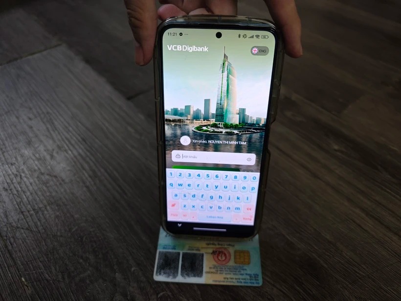 Sau đó anh Tăng đã phải tìm đến chi nhánh ngân hàng để nhờ nhân viên hướng dẫn. Theo hướng dẫn trên điện thoại, ở bước này, người dùng cần áp sát căn cước công dân vào vị trí phía trên thiết bị.