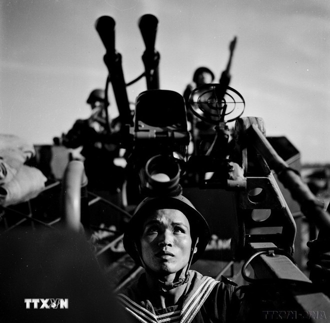 Chiến sĩ bắn súng máy Đặng Văn Thép (đoàn viên 4 tốt) thuộc tàu A, phân đội Hải quân đã hiệp đồng chặt chẽ với các khẩu đội, bảo vệ vững chắc vùng biển, vùng trời Tổ quốc (1968). (Ảnh: Đoàn Tý/TTXVN)