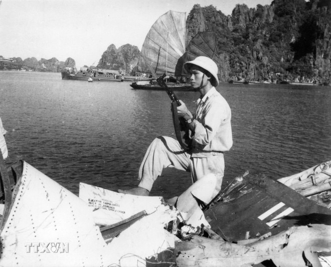 Bộ đội ta bên xác máy bay phản lực A4D, do Trung úy Hải quân Mỹ Everett Alvarez Jr lái, bị bắn hạ tại Cửa Lục, thị xã Hòn Gai (Quảng Ninh) ngày 5/8/1964. (Ảnh: TTXVN)