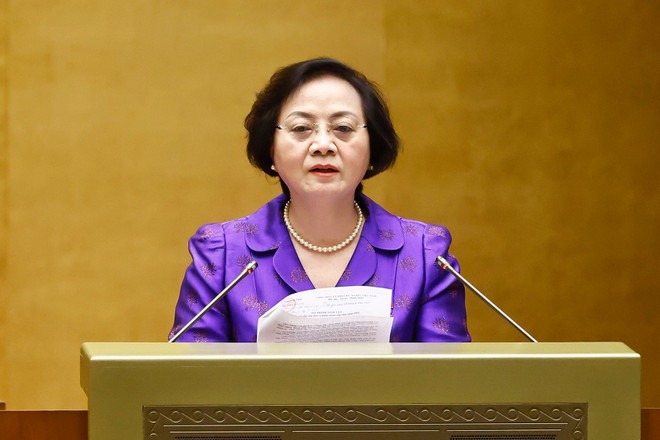 Bộ trưởng Bộ Nội vụ Phạm Thị Thanh Trà trình bày Tờ trình về việc sắp xếp đơn vị hành chính cấp tỉnh năm 2025. (Ảnh: TTXVN)
