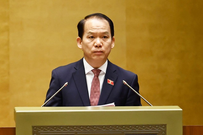 Chủ nhiệm Ủy ban Pháp luật và Tư pháp của Quốc hội Hoàng Thanh Tùng trình bày Báo cáo thẩm tra về việc sắp xếp đơn vị hành chính cấp tỉnh năm 2025. (Ảnh: TTXVN)