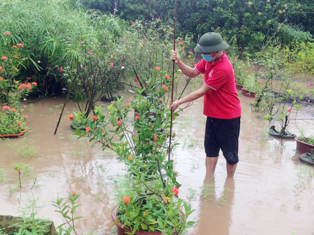 Nông dân xã Tân Tiến (Văn Giang) chống úng cho diện tích cây cảnh