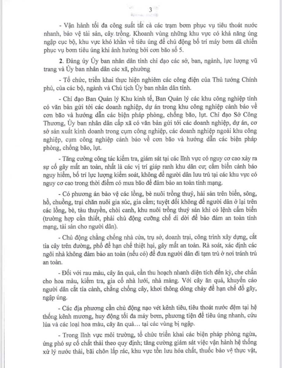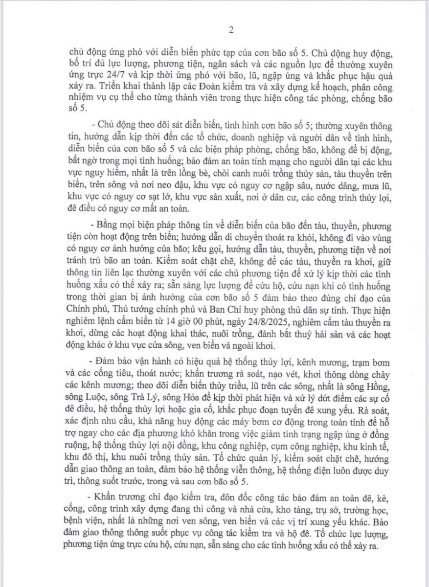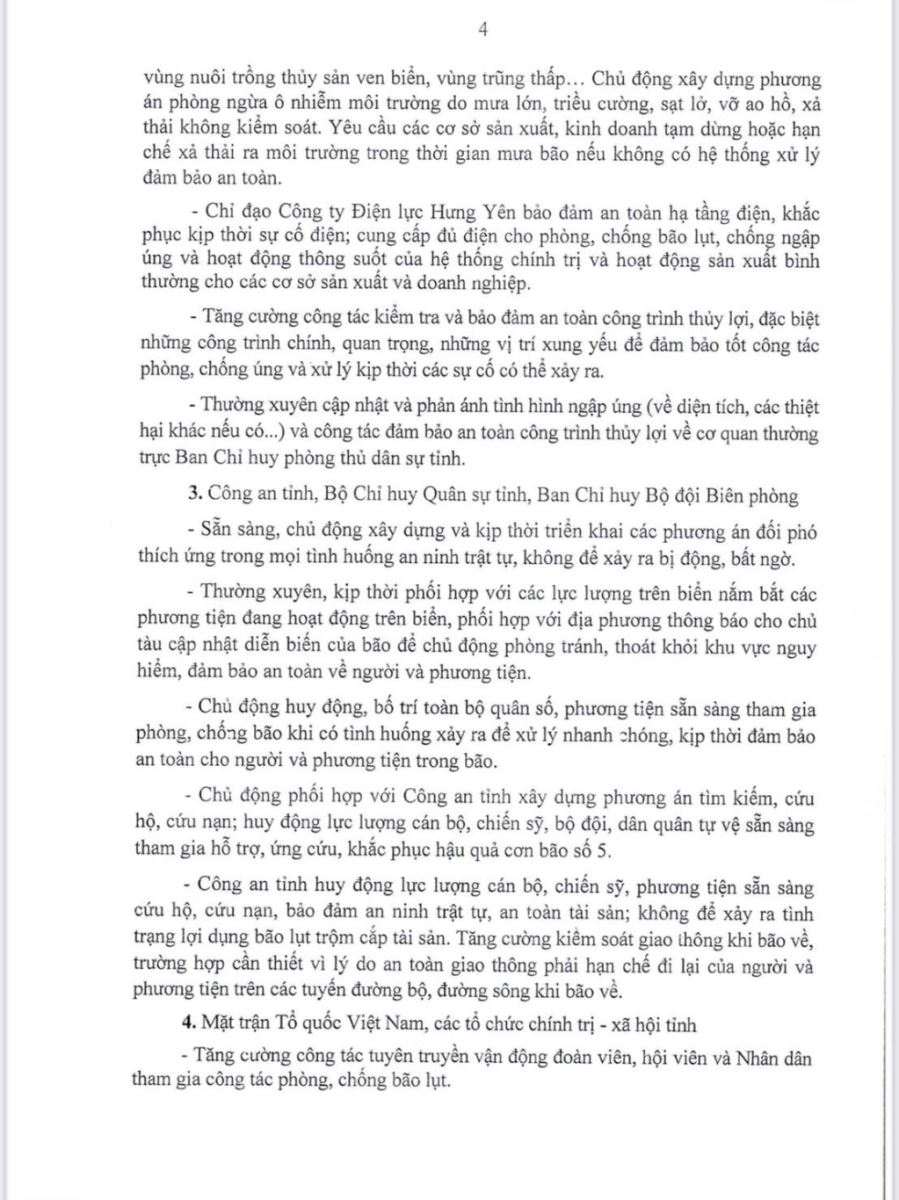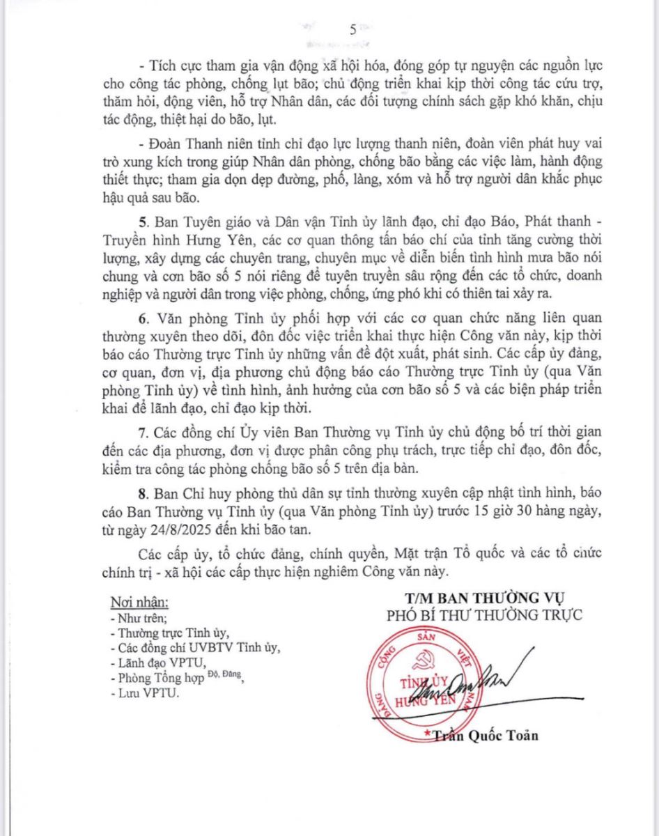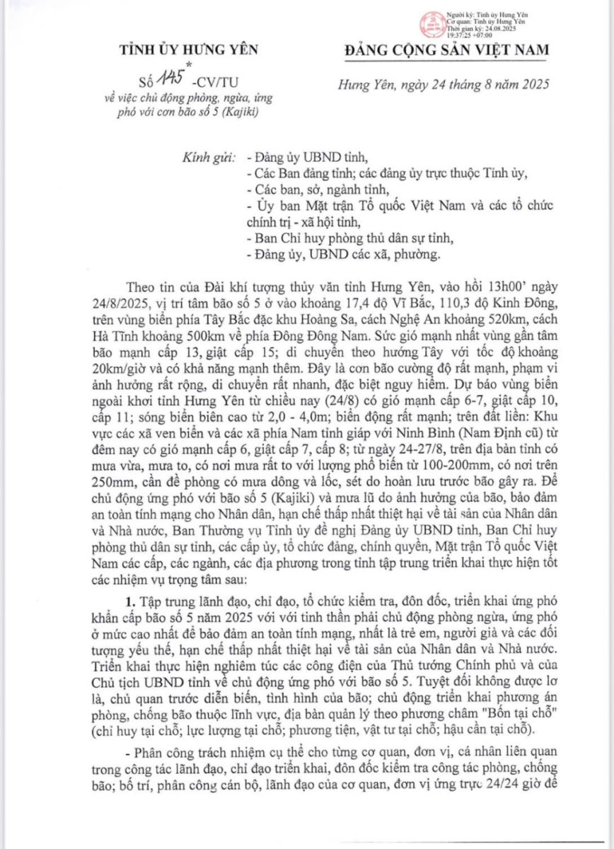Ngày 24/8/2025, Ban Thường vụ Tỉnh ủy Hưng Yên ban hành Công văn số 145-CV/TU về việc chủ động phòng ngừa, ứng phó với cơn bão số 5 (Kajika). Nội dung Công văn như sau: