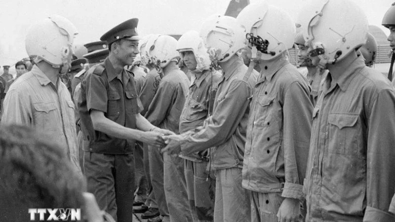 Phó Thủ tướng, Bộ trưởng Quốc phòng Lào Khamtay Siphandone thăm Bộ tư lệnh Quân khu 7 và thăm Sân bay Biên Hòa (1977). (Ảnh: Hứa Kiểm/TTXVN)