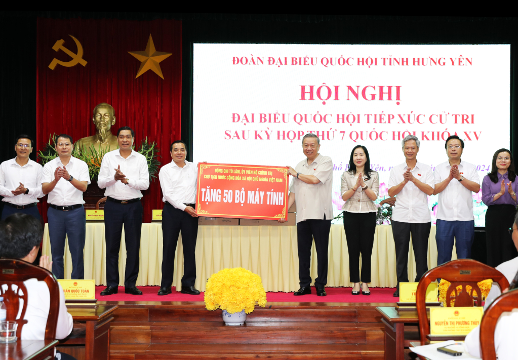 Nhân dịp này, Chủ tịch nước Tô Lâm trao 50 bộ máy tính tặng thành phố Hưng Yên.