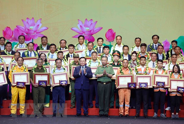 Chủ tịch Quốc hội Vương Đình Huệ và Đại tướng Tô Lâm, Bộ trưởng Bộ Công an tuyên dương các điển hình trong phong trào phòng cháy, chữa cháy và cứu nạn, cứu hộ. (Ảnh: Phạm Kiên/TTXVN)