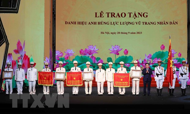 Chủ tịch Quốc hội Vương Đình Huệ trao tặng danh hiệu Anh hùng Lực lượng Vũ trang Vhân dân cho ba tập thể và một cá nhân về công tác phòng cháy, chữa cháy và cứu nạn, cứu hộ. (Ảnh: Phạm Kiên/TTXVN)