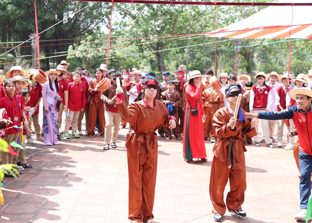 Học sinh tham gia trò chơi đập niêu đất
