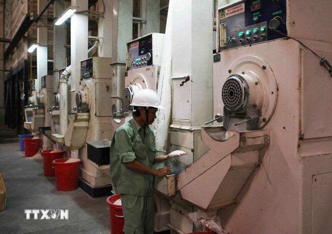 Dây chuyền chế biến gạo phục vụ thị trường trong nước và xuất khẩu ở nhà máy của Tập đoàn Lộc Trời (tỉnh An Giang). (Ảnh: Vũ Sinh/TTXVN)