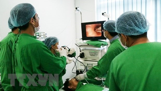 Các bác sỹ Bệnh viện Chợ Rẫy Phnom Pênh thực hiện phẫu thuật nội soi tai mũi họng cho bệnh nhân Campuchia. (Ảnh: TTXVN)