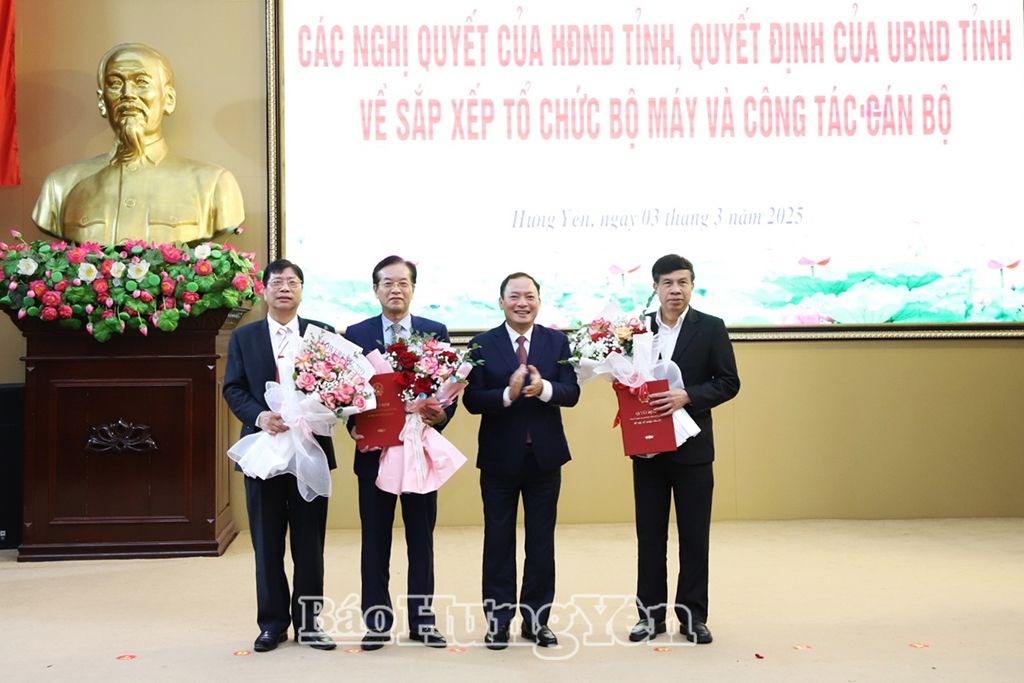 Sau lễ công bố các quyết định của Ban Thường vụ Tỉnh ủy, Ban Thường vụ Đảng ủy UBND tỉnh diễn ra hội nghị công bố các nghị quyết của HĐND tỉnh, quyết định của UBND tỉnh về sắp xếp tổ chức bộ máy và công tác cán bộ. Theo đó, hội nghị công bố các nghị quyết của HĐND tỉnh về việc thành lập các Sở: Tài chính, Nội vụ, Nông nghiệp và Môi trường, Khoa học và Công nghệ, Xây dựng; công bố các quyết định của UBND tỉnh quy định về chức năng, nhiệm vụ, cơ cấu nhiệm vụ của các sở mới thành lập; công bố Quyết định của Chủ tịch UBND tỉnh bổ nhiệm giám đốc, phó giám đốc các sở mới thành lập; công bố các quyết định điều động, bổ nhiệm lãnh đạo một số cơ quan, đơn vị; công bố các quyết định nghỉ công tác chờ đủ tuổi nghỉ hưu và nghỉ hưu trước tuổi theo Nghị định số 178/2024/NĐ-CP ngày 31/12/2024 của Chính phủ...