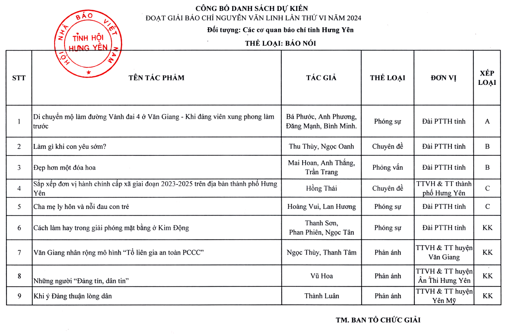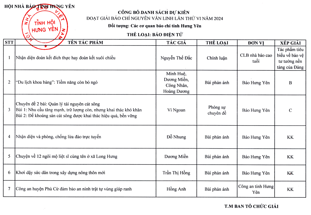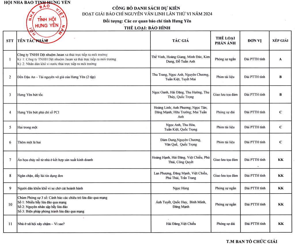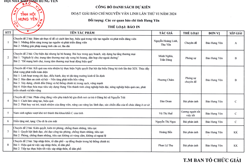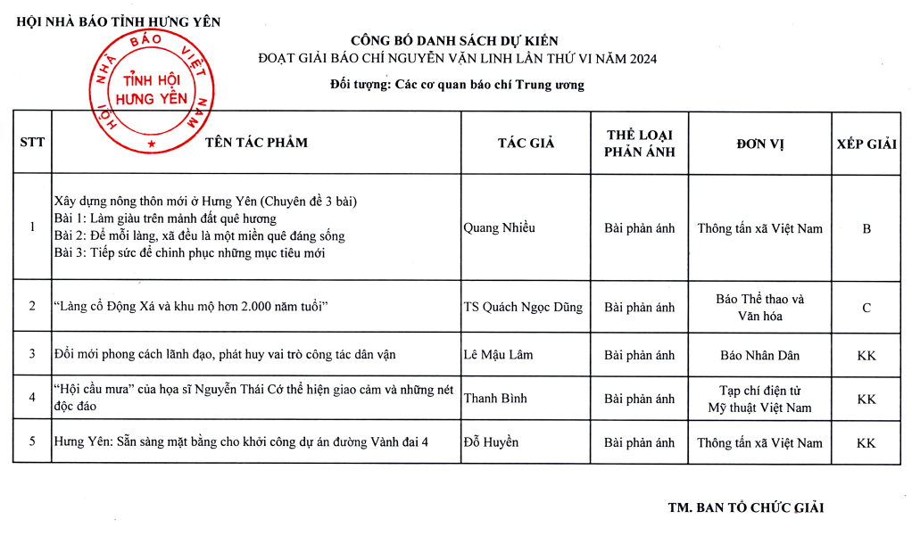 Hội Nhà báo tỉnh Hưng Yên – cơ quan thường trực Giải, trân trọng đề nghị Ban Biên tập Báo Hưng Yên, Ban Giám đốc Đài PT&TH tỉnh công bố Danh sách dự kiến đoạt Giải báo chí Nguyễn Văn Linh lần thứ VI năm 2024 trên Báo Hưng Yên và Đài PT&TH tỉnh. (có Danh sách kèm theo).