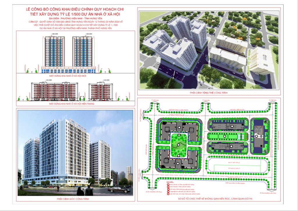 Dự án nhà ở xã hội do Công ty cổ phần Đầu tư xây dựng nhà ở Hưng Yên làm chủ đầu tư, được triển khai trên địa bàn phường Hiến Nam (thành phố Hưng Yên). Ngày 12/3/2024, UBND tỉnh ban hành Quyết định số 558/QĐ-UBND phê duyệt Đồ án điều chỉnh quy hoạch chi tiết xây dựng tỉ lệ 1/500 dự án nhà ở xã hội tại phường Hiến Nam. Theo quyết định, phạm vi ranh giới nghiên cứu lập điều chỉnh quy hoạch chi tiết xây dựng tỉ lệ 1/500 dự án nhà ở xã hội được thực hiện trên địa bàn quản lý của phường Hiến Nam. Phía Bắc giáp đường Hoàng Quốc Việt, phía Nam giáp đường Lê Thanh Nghị và đường Lê Văn Hưu, phía Đông giáp đường Nguyễn Lương Bằng, phía Tây giáp đường Nguyễn Bình. Quy mô dân số trong khu vực lập điều chỉnh quy hoạch khoảng 4.800 người; diện tích đất nghiên cứu, lập điều chỉnh quy hoạch khoảng 29.951m2 . Tầng cao công trình điều chỉnh dự kiến từ 9 tầng lên 19 tầng. Các chỉ tiêu sử dụng đất, giải pháp quy hoạch không gian cây xanh, không gian sinh hoạt cộng đồng, bãi đỗ xe cho cư dân... được tính toán, đáp ứng quy chuẩn, quy hoạch xây dựng khu nhà ở xã hội thuộc đô thị loại III...