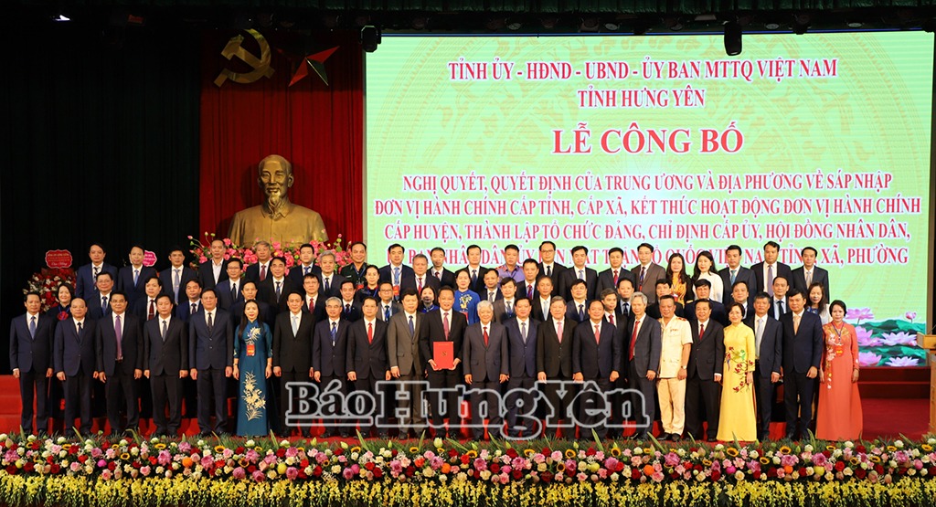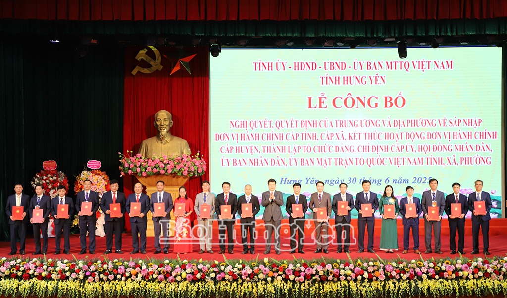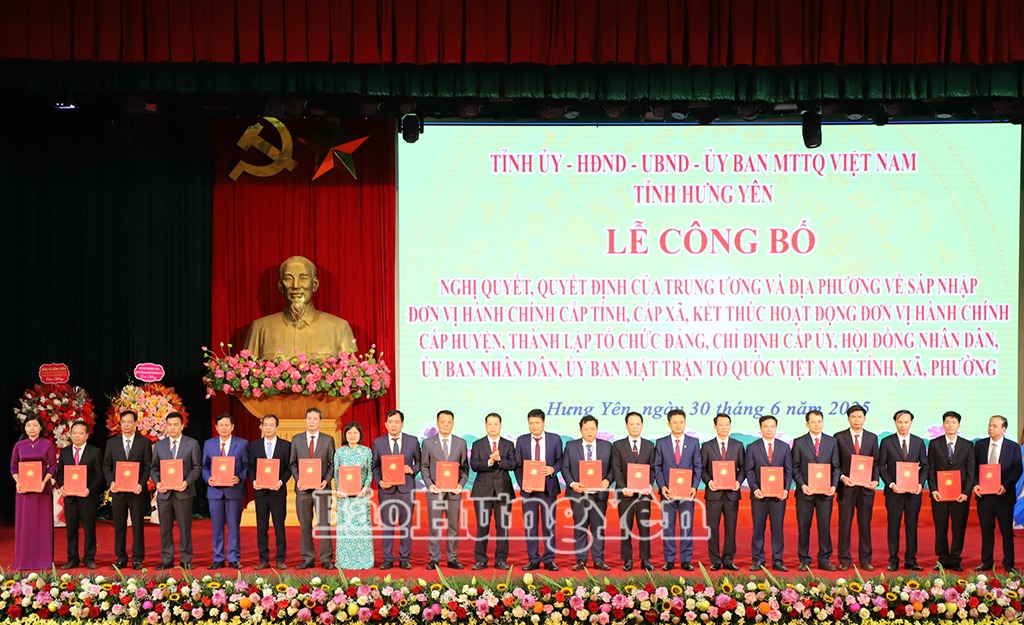 Trong không khí trang nghiêm của buổi lễ, đồng chí Nguyễn Mạnh Khương, Thứ trưởng Bộ Nội vụ công bố Nghị quyết của Quốc hội về việc sắp xếp ĐVHC cấp tỉnh; kết thúc hoạt động của ĐVHC cấp huyện. Nghị quyết của Ủy ban Thường vụ Quốc hội về sắp xếp ĐVHC cấp xã của tỉnh Hưng Yên năm 2025; chỉ định Chủ tịch, Phó Chủ tịch, Trưởng các ban của HĐND tỉnh Hưng Yên nhiệm kỳ 2021 – 2026; chỉ định Trưởng đoàn, Phó Trưởng đoàn ĐBQH khóa XV tỉnh Hưng Yên. Quyết định của Bộ Chính trị về thành lập Đảng bộ tỉnh Hưng Yên; chỉ định BCH, Ban Thường vụ Tỉnh ủy, Bí thư Tỉnh ủy Hưng Yên. Quyết định của Ban Bí thư chỉ định Ủy viên, Chủ nhiệm, Phó Chủ nhiệm Ủy ban Kiểm tra Tỉnh ủy Hưng Yên nhiệm kỳ 2020 – 2025 sau sắp xếp. Quyết định của Thủ tướng Chính phủ chỉ định nhân sự giữ chức vụ Chủ tịch, Phó Chủ tịch UBND tỉnh Hưng Yên nhiệm kỳ 2021 – 2026. Quyết định của Ủy ban Trung ương MTTQ Việt Nam thành lập Ủy ban MTTQ Việt Nam tỉnh.