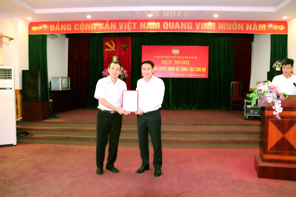 Tại hội nghị, Ban Thường trực Ủy ban MTTQ Việt Nam tỉnh công bố Quyết định số 2117/QĐ-MTTW-BTT, ngày 18/10/2023 của Ban Thường trực Ủy ban Trung ương MTTQ Việt Nam về việc công nhận chức vụ Phó Chủ tịch Ủy ban MTTQ Việt Nam tỉnh Hưng Yên. Theo đó, đồng chí Đào Xuân Dũng, Phó Hiệu trưởng Trường Chính trị Nguyễn Văn Linh giữ chức vụ Phó Chủ tịch Ủy ban MTTQ Việt Nam tỉnh Hưng Yên khóa XV, nhiệm kỳ 2019 - 2024 kể từ ngày 6/10/2023.